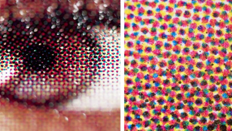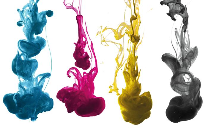 喷墨技术呈现颜色的方式和绘画颜料类似,都是以青色 (Cyan) 洋红色 (Magenta) 及黄色 (Yellow) 色料混合形成影像,也就是所谓的减色法。和绘画不同的是,喷墨技术无法将墨水混好颜色之后再绘制到纸材上,而是利用许多细小的纯色墨点让人眼看起来像是全彩影像。若使用高倍放大镜观察喷墨输出的影像,就可以看到各色的墨水在纸材上形成一个个的墨点…