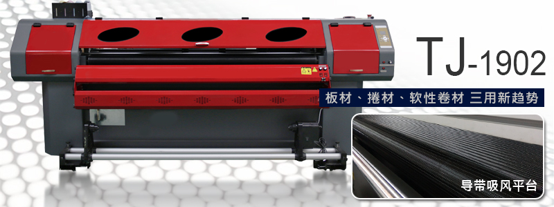 TJ-1902W导带直喷绘图机,不仅购机成本降低,两颗五代喷头的喷印速度,板材、卷材、软性卷材 三用,能增加生产效率…是广告输出业增添战力的最佳选择。